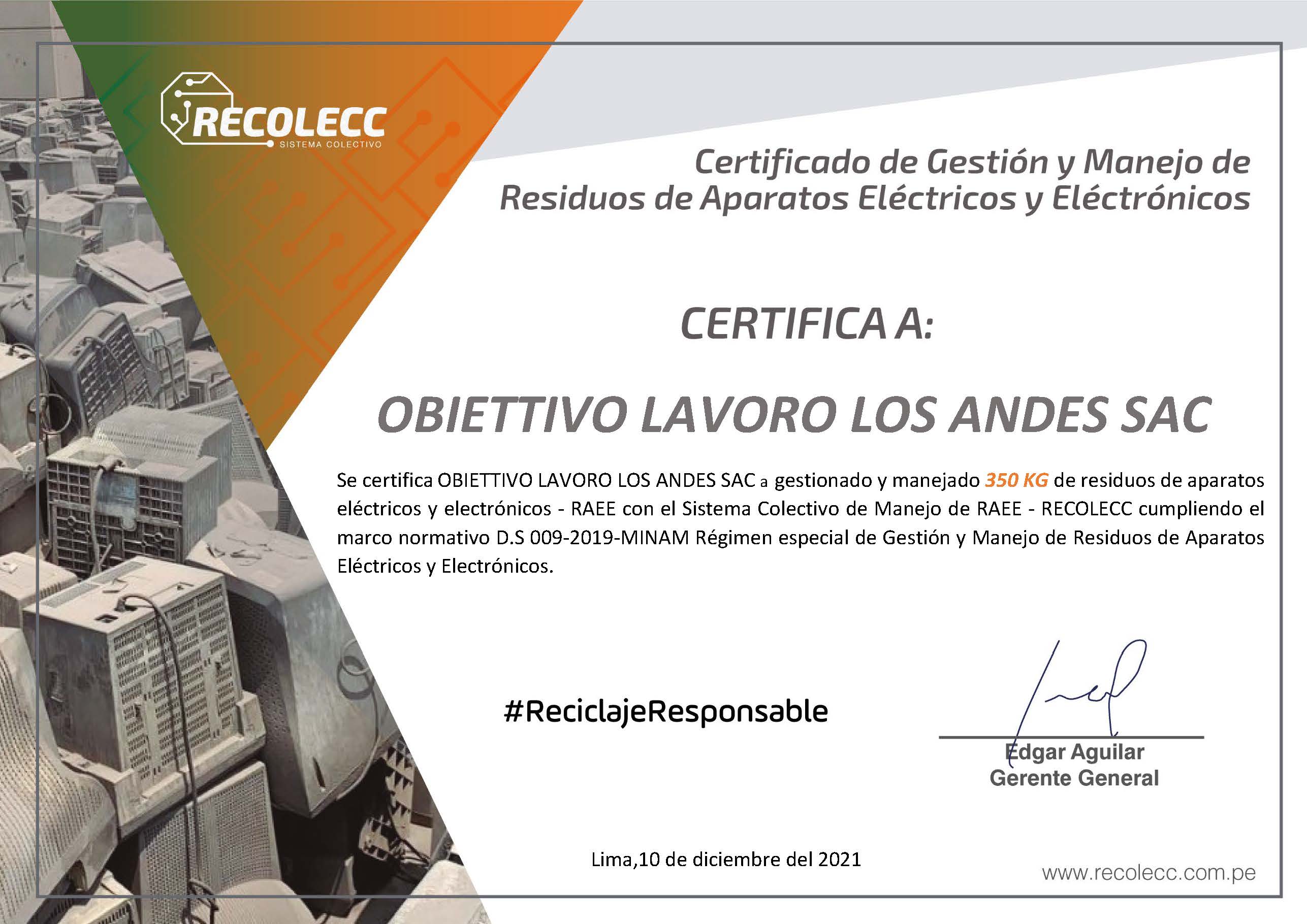 Lavoro es certificado por la buena gestión  y manejo de residuos  de aparatos eléctricos.